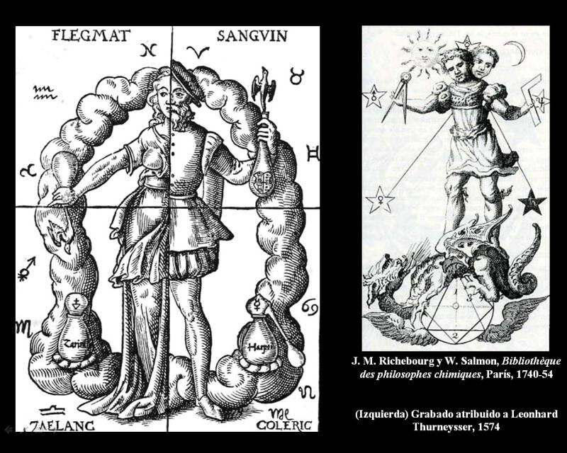 Figuur 2 16e-eeuwse Duitse illustratie van de vier humores: Flegma (sputum), Sanguin (bloed), Cholerisch (gele gal) en Melancholisch (zwarte gal)