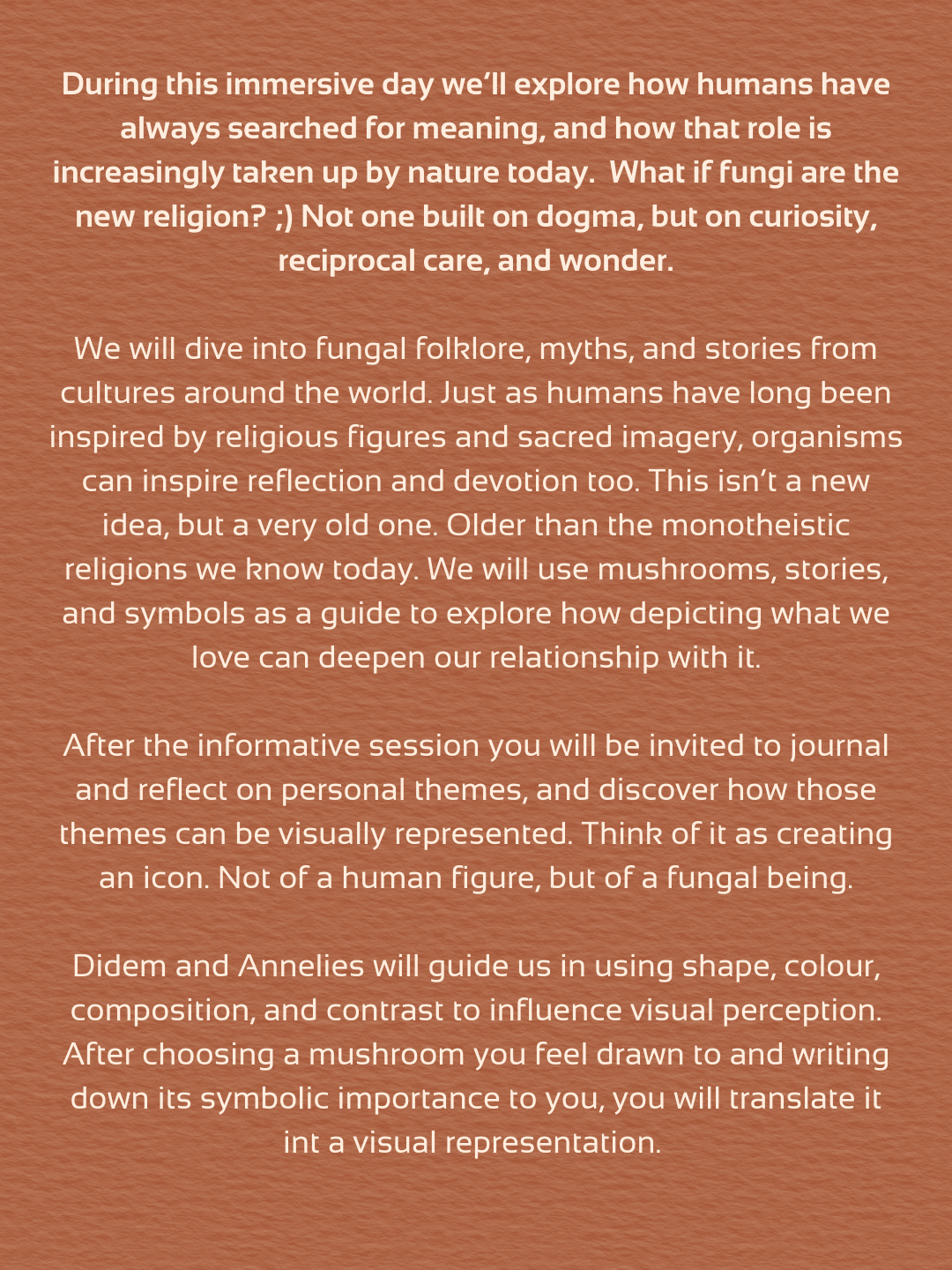 During this immersive day we’ll explore how humans have always searched for meaning, and how that role is increasingly taken up by nature today. What if fungi are the new religion? ;) Not one built on dogma, but on curiosity, reciprocal care, and wonder.